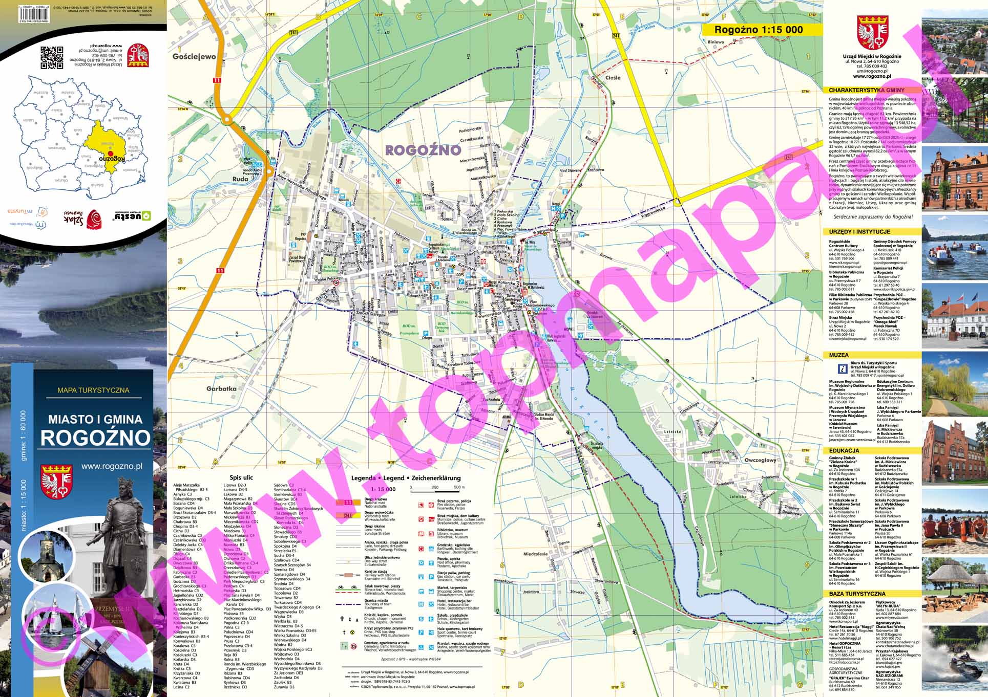 Wydanie drugie mapy Miasto i gmina Rogoźno zawierające dokładny plan miasta (w skali 1:15 000) wraz ze spisem ulic, oraz mapę gminy (w skali 1:60 000), zostało przygotowane na zlecenie Urzędu Miasta w Rogoźnie. Mapy posiadają zgodność z GPS (układ współrzędnych WGS84), oraz zawierają dokładną sieć dróg, granice administracyjne, granice obszarów chronionych, informacje praktyczne, zabytki i ciekawostki, znakowane szlaki piesze, rowerowe i kajakowe, rezerwaty przyrody oraz ścieżki dydaktyczne. Szczegółowy plan stolicy gminy zawiera dodatkowo dokładne położenie szkół i przedszkoli, służby zdrowia, poczty, hoteli, stacji benzynowych i parkingów, oraz obiektów sportowo-rekreacyjnych i przystanków autobusowych. Na mapie znajduje się też charakterystyka gminy, jej historia, opis najciekawszych zabytków, szlaków turystycznych oraz obiektów cennych przyrodniczo. Na mapie zaznaczono przebieg szlaku kajakowego bardzo uczęszczanej rzeki Wełny.