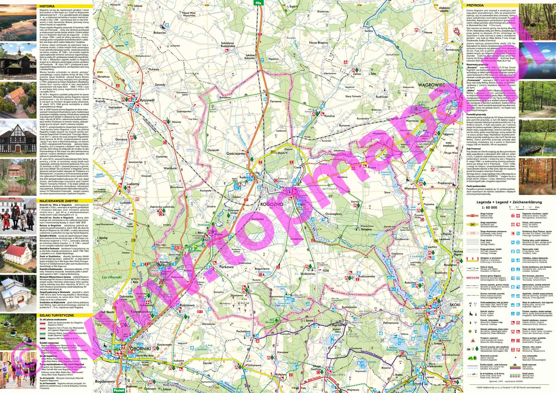 mapa gminy z granicami obszarów chronionych, zabytkami i ciekawostkami, znakowanymi szlakami pieszymi, rowerowymi i kajakowymi oraz plan miasta Rogoźno